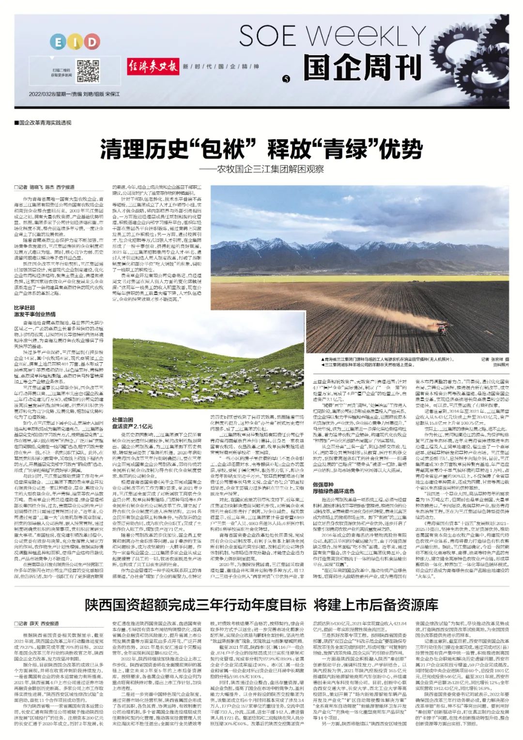 日前,《經(jīng)濟(jì)參考報(bào)》刊發(fā)青海省三江集團(tuán)有限公司專(zhuān)版文章《清理歷史“包袱“ 釋放“青綠”——農(nóng)牧國(guó)企三江集團(tuán)解困觀(guān)察》,深入介紹省三江集團(tuán)抓住國(guó)企改革三年行動(dòng)契機(jī),三江集團(tuán)通過(guò)加強(qiáng)頂層設(shè)計(jì),完善現(xiàn)代企業(yè)制度建設(shè),優(yōu)化企業(yè)布局和經(jīng)濟(jì)結(jié)構(gòu),聚焦主責(zé)主業(yè),清理包袱負(fù)擔(dān),作為國(guó)家級(jí)農(nóng)牧業(yè)產(chǎn)業(yè)化發(fā)展龍頭企業(yè)逐漸走出了一條構(gòu)建具有高原特色的現(xiàn)代農(nóng)牧業(yè)產(chǎn)業(yè)體系的革新之路。敬請(qǐng)關(guān)注。