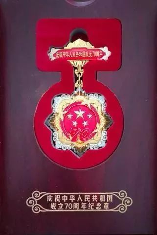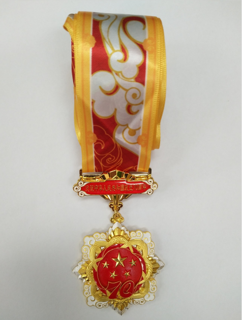 紀(jì)念章使用銅胎鍍金材質(zhì),通徑為50毫米,主要元素為五星、“70”飄帶、團錦結(jié)、如意祥云和光芒,主色調(diào)為紅色和金色。核心部分為五星,代表國家榮譽?!?0”飄帶象征中華人民共和國70年奮斗歷程。團錦結(jié)環(huán)繞在五星和“70”飄帶周圍,寓意全國各族人民大團結(jié),構(gòu)建人類命運共同體的愿景。章體外環(huán)以如意祥云、光芒構(gòu)成,象征人民對美好生活的向往,同時表達隆重慶祝中華人民共和國生日,禮贊國家富強、民族振興、人民幸福的輝煌成就,以及在70年輝煌奮斗成就的基礎(chǔ)上不忘初心、繼續(xù)前進的堅定決心。
