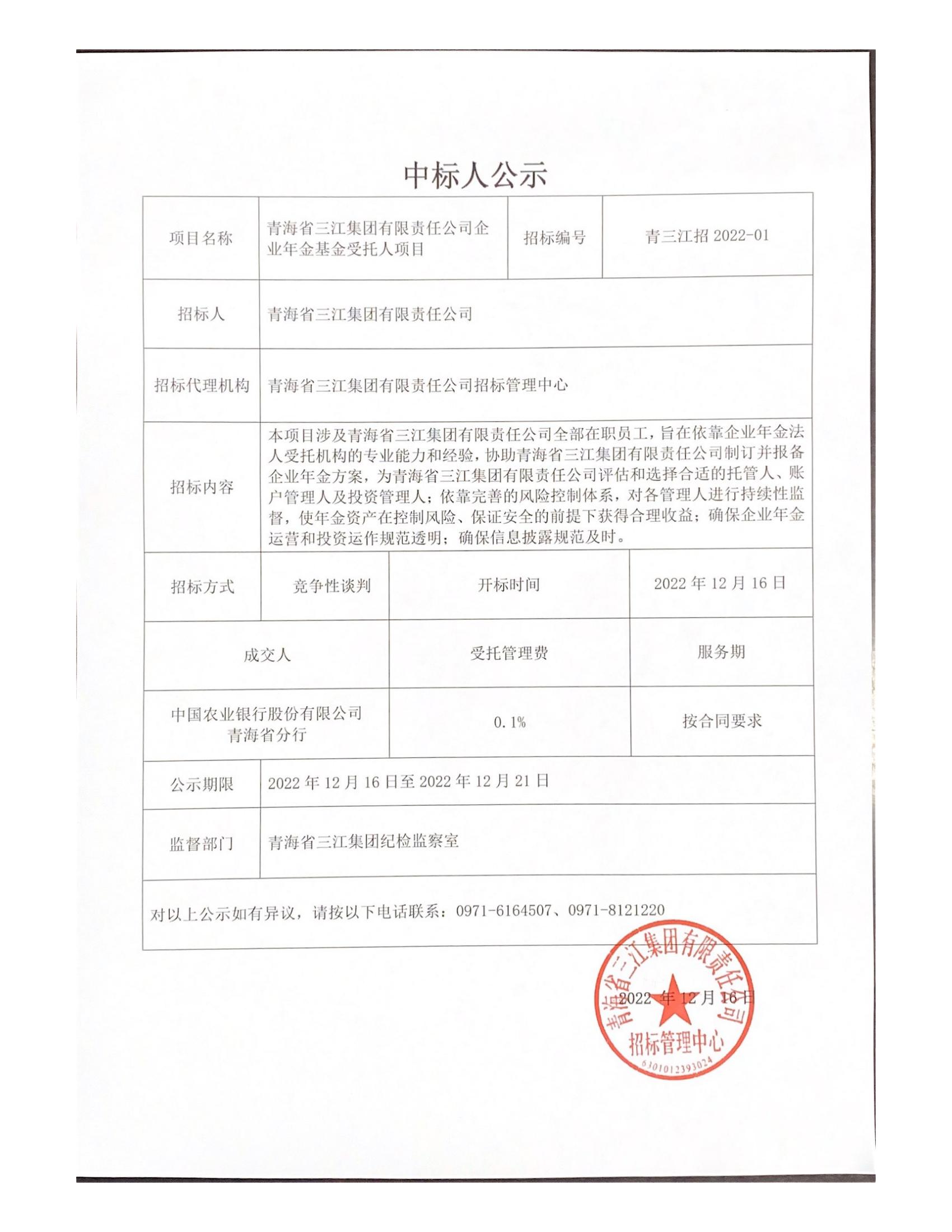 青海省三江集團(tuán)有限責(zé)任公司企業(yè)年金基金受托人項(xiàng)目中標(biāo)人公示
